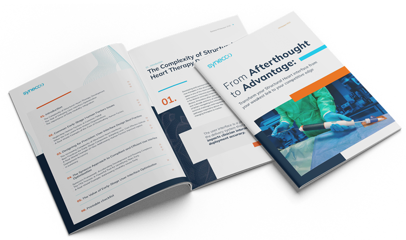 Developing structural heart devices is challenging, from minimising use error to compliance with standards like IEC 62366. Synecco provides the expertise and support you need to overcome these obstacles. Let us guide you through the complexities of user interface design & development for structural heart delivery systems.